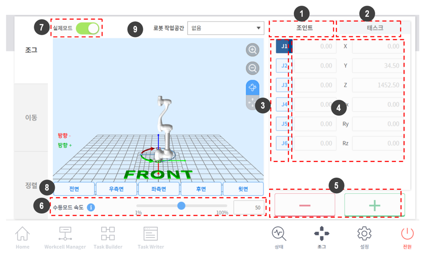 4 | 좌표 표시 | 현재 조그 모드로 사용 중인 로봇의 위치 좌표가 표시됩니다. 방향 버튼을 눌러 로봇의 위치가 변경되면 좌표값도 함께 변경됩니다. |
