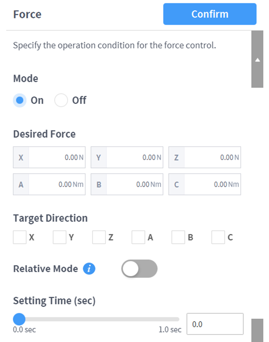- 힘 설정 후 반드시 방향을 설정해야만 힘 제어가 동작합니다.