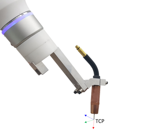 용접 토치의 와이어 끝단을 중심으로 선작업을 하는 용접작업에서 용접 토치의 TCP 정보를 올바르게 입력하는 것은 매우 중요합니다. 용접작업 시 TCP위치는 용접토치로부터 토출된 와이어의 길이(Stick-out)까지 고려하여 입력하여야 합니다. 아래 그림을 참조하세요.