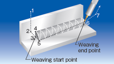 용접 중 용접진행방향에 폭방향(lateral)으로 반복적으로 흔들어주는 모션을 위빙모션이라 합니다. 위빙모션을 이용하면 용접 시 접합선 주변부를 넓게 용융시켜 넓은 용접비드를 얻을 수 있으며 접합부에 갭이 발생한 경우에도 많이 사용합니다. 로봇은 다양한 종류의 위빙궤적 및 이를 조정하기 위한 옵션을 제공합니다.