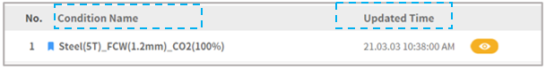 | 저장된 용접 조건을 리스트 형태로 확인할 수 있습니다. 용접 조건은 최대 500개까지 저장 가능합니다. 리스트의 기본 정렬은 최신 업데이트 순서로 정렬됩니다.