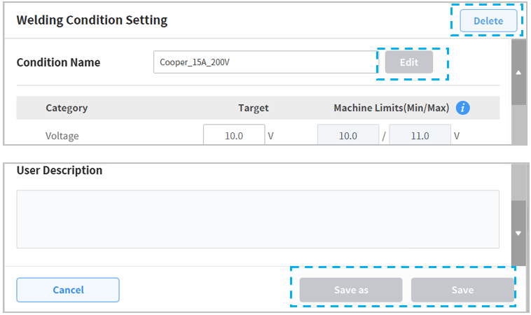 | 용접 조건 보기 | 저장된 용접 조건의 상세 설정을 확인할 수 있습니다. 팝업창으로 실행되며 편집(Edit) 버튼을 이용하여 저장된 설정값을 수정할 수 있습니다. 수정 후 저장 또는 다른 이름으로 저장(복제 기능과 동일)이 가능합니다.