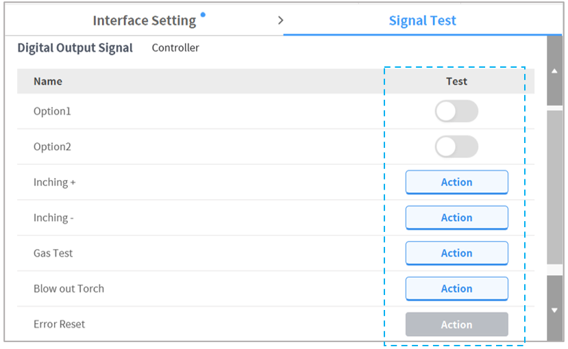 인터페이스 설정 완료 후 설정한 신호를 테스트할 수 있습니다. 설정된 항목의 경우 버튼이 활성화되며, 버튼을 눌러 신호를 보낼 수 있습니다.