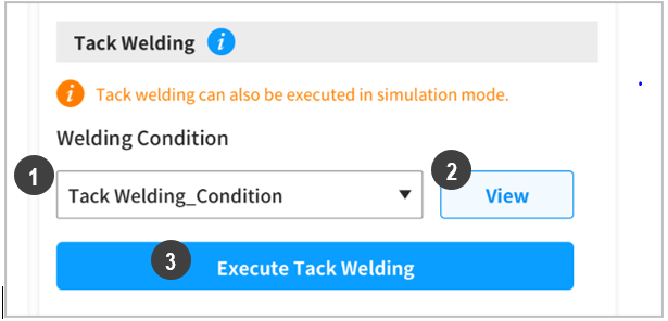 본 용접을 하기 전에 정한 위치에 용접물의 부재를 고정하기 위한 태크 용접 기능을 제공합니다. 태크 용접을 위한 용접 조건 생성이 필요하며, 직접교시 기능을 활용하여 신속하게 로봇을 이동시켜 태크 용접을 수행할 수 있습니다. 아래의 2가지 방법으로 태크 용접을 진행할 수 있습니다.
