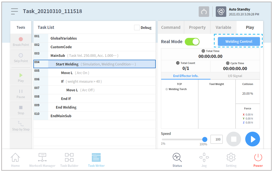 용접 태스크를 실행하며 용접상태를 모니터링하고, 실시간 조정할 수 있습니다. 태스크 내에 용접 명령어가 포함된 경우 Play탭에 용접 조건 조정(Welding Control) 버튼이 활성화됩니다. 버튼을 누르면 모니터링 및 조정이 가능한 팝업창이 실행됩니다.