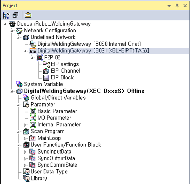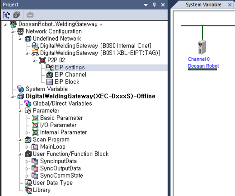 (Project Tree)Network Configuration → Undefined Network → XBL-EIPT(TAG) →P2P 02 → EIP settings 선택