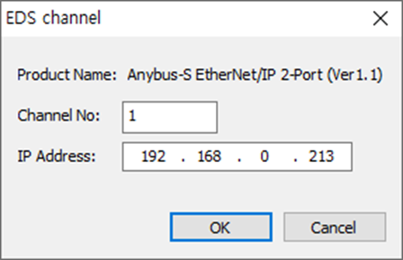 - 등록이 완료되면 우측 EDS 정보에 해당하는 Device를 찾은 후 EIP에 추가로 등록합니다.등록과 동시에 채널1번의 IP Address에 Welding Machine의 IP Address를 입력합니다.