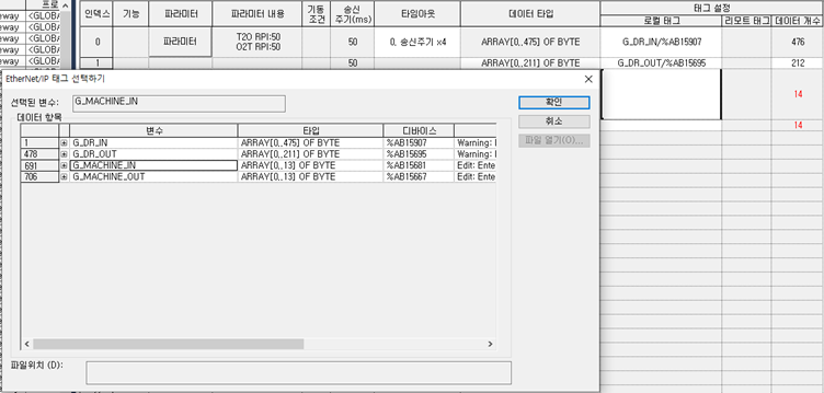 Welding Machine의 로컬태그는 Input의 경우에는 G_MACHINE_IN을, Output의 경우에는 G_MACHINE_OUT을 선택합니다. EDS를 이용한 상세 EtherNet/IP 설정은 제조사 Datasheet를 참조해주세요.