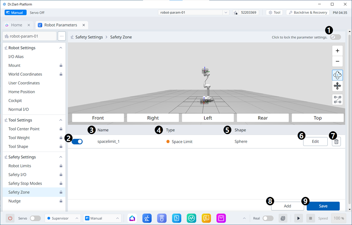 | 9 | Opslaan | Met deze knop kunt u alle wijzigingen in de instellingen met betrekking tot de veiligheidszone opslaan. |