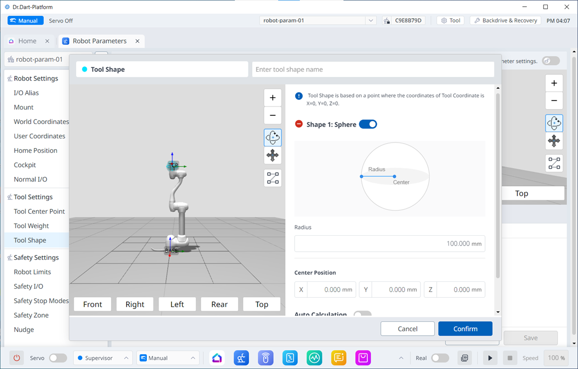 De vorm van het gereedschap kan worden ingesteld in de module Robot parameters > Tool Settings > Tool Shape. Zie voor meer informatie Tool Shape Setting.