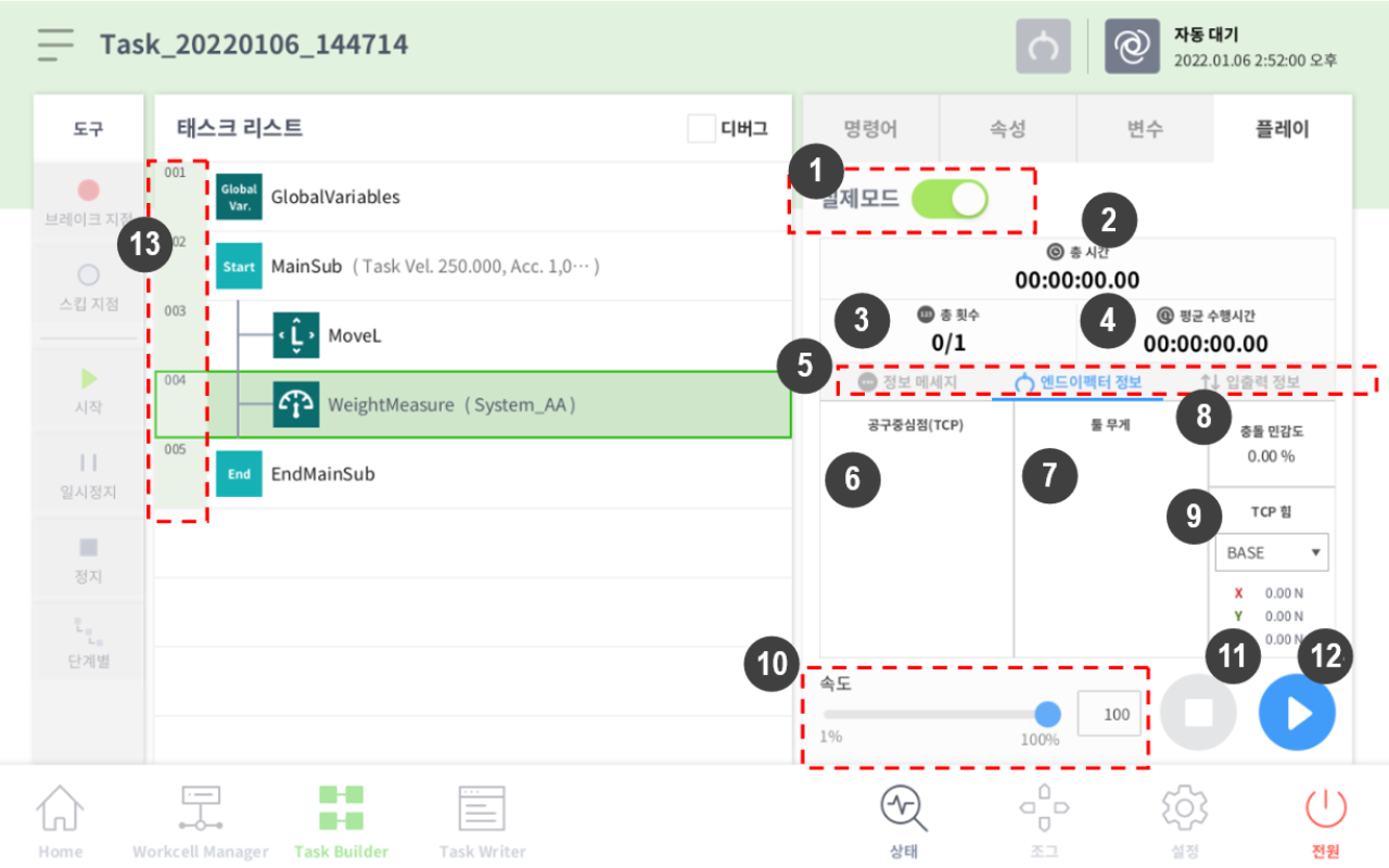 Het tabblad Eindeffectorinformatie in het scherm Real-modus van Task Builder is als volgt ingedeeld: