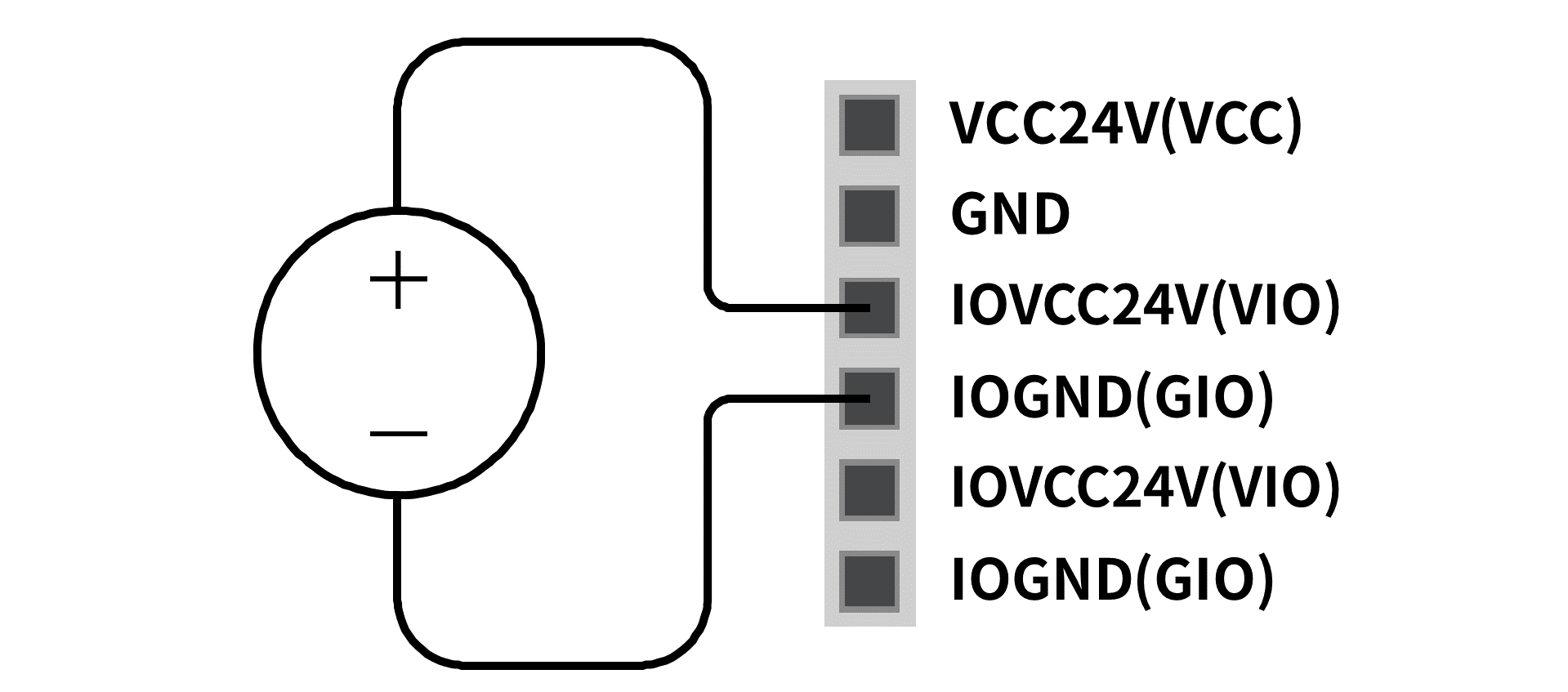 Als meer stroom dan 2 A is vereist, moet u VCC en GND scheiden. In dat geval moet er een afzonderlijke externe voedingsbron (24 V) worden aangesloten met VIO- en GIO-klemmen.