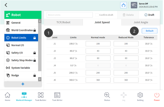 2 | Default Value | Hiermee worden de instellingen voor gewrichtshoeklimieten opnieuw ingesteld op standaardwaarden. |