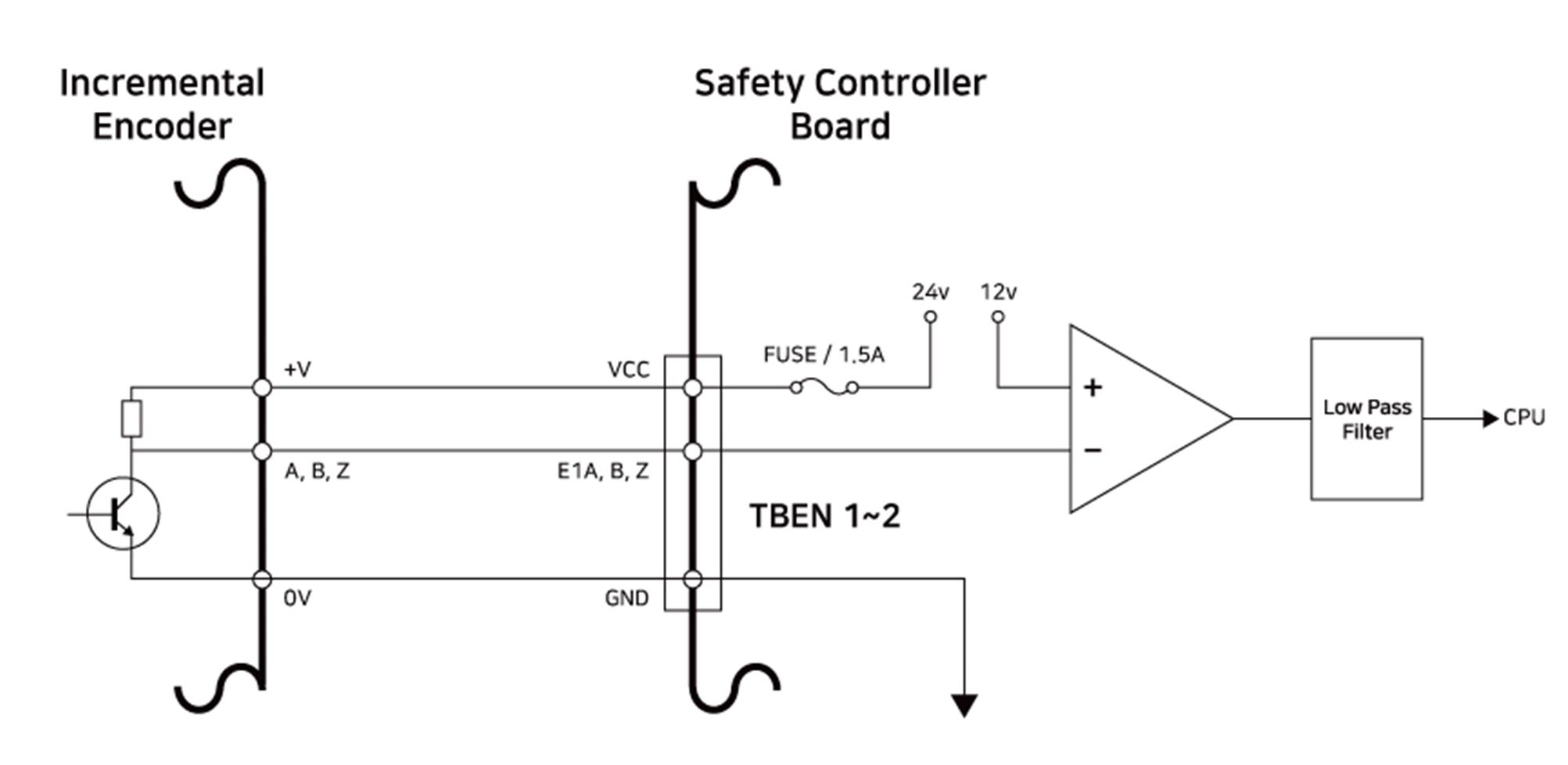 De regelaar is voorzien van twee TBEN-klemmen die de invoer van externe encoders mogelijk maken. Deze ondersteunen A-, B- en Z-fasen als input en voeren tellingen uit op basis van 12 VDC. Bovendien kan de S-fase worden gebruikt als de Start sensor van de transportband.