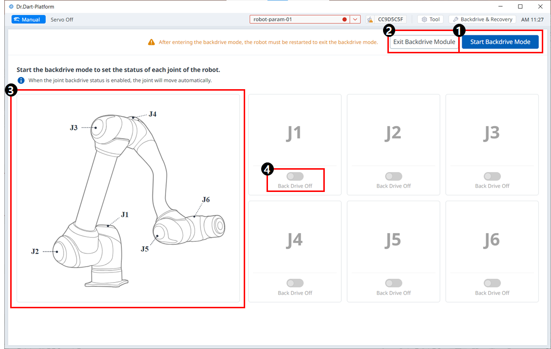 Napęd wsteczny odcina zasilanie silników, zwalniając tylko hamulce, aby umożliwić przegubom robota poruszanie się pod wpływem siły zewnętrznej. Ta funkcja jest używana, gdy robot nie może powrócić do normalnego stanu w trybie odzyskiwania lub ręcznym prowadzeniu. W trybie Backdrive użytkownik może włączyć lub wyłączyć hamulec każdego połączenia.