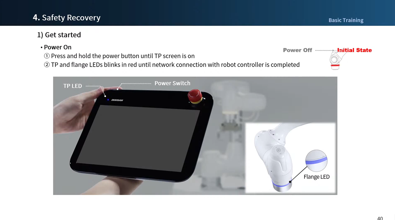 Aby wyłączyć system, należy nacisnąć przycisk wyłączania na manipulatorze programowania lub nacisnąć i przytrzymać przez 2 sekundy przycisk zasilania w lewym górnym rogu manipulatora programowania.