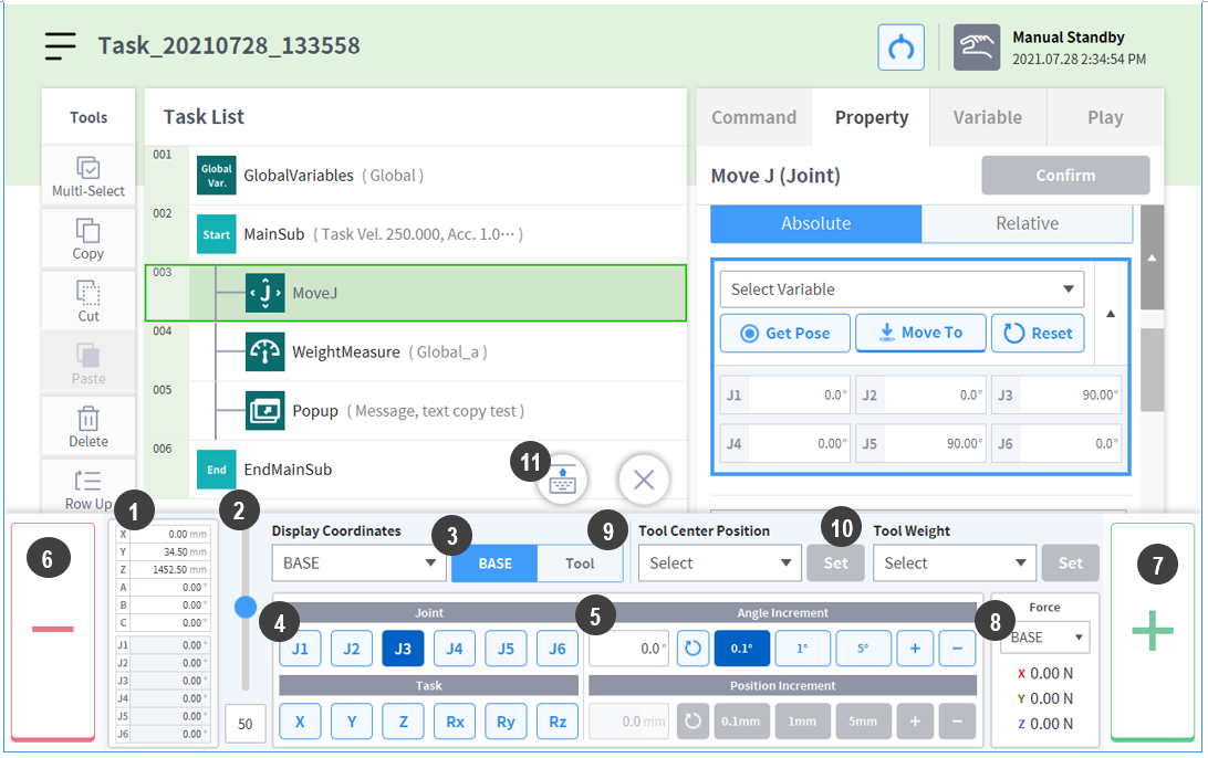 4 | Select Axis | Wybiera oś, która ma zostać przesunięta. Karta Joint: Wybrać jedną z osi z zakresu od J1 do J6. Karta Task: Wybrać jedną z osi z zakresu od X do Rz. |