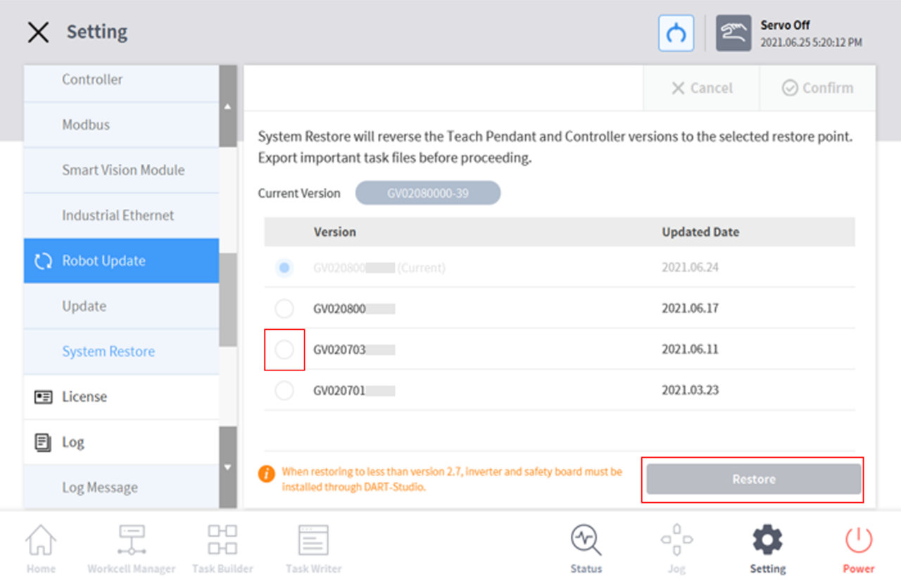 Przywraca system robota do określonej wersji wybranej przez użytkownika.
