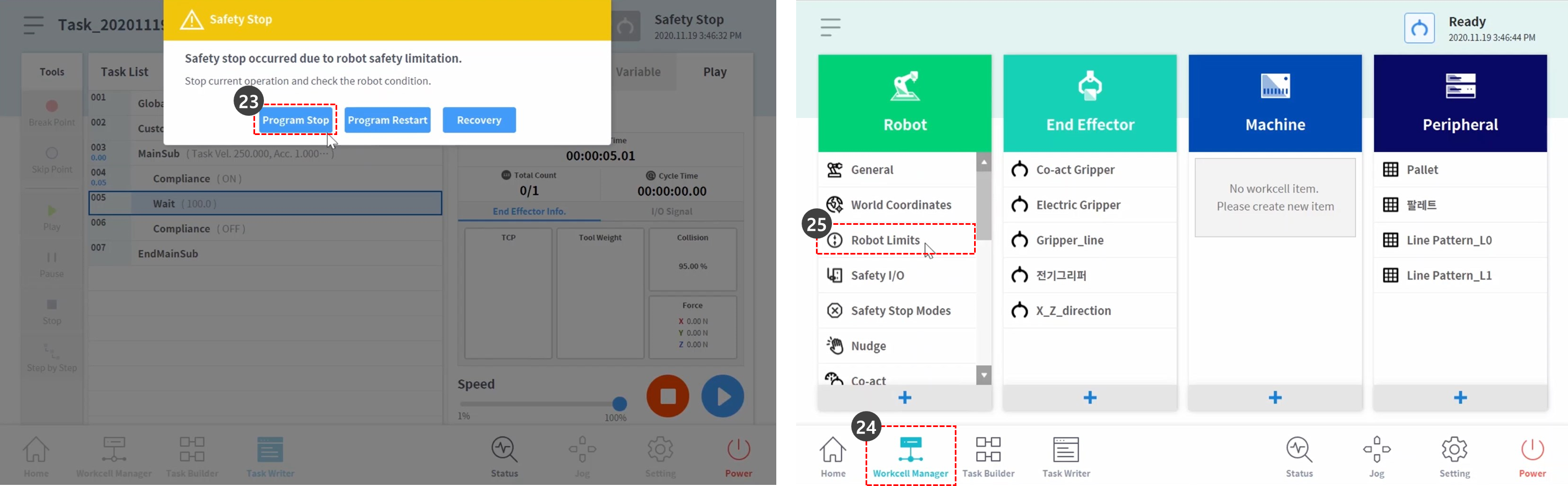 - Nacisnąć przycisk zatrzymania programu w żółtym oknie ostrzegawczym zatrzymania awaryjnego na ekranie. Program zadań w toku jest zatrzymany.