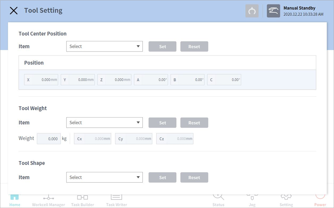 Służy do ustawiania punktu środkowego narzędzia, ciężaru i kształtu, który działa jako podstawa ruchu robota. Użytkownik może ustawiać i aktywować wiele efektorów końcowych oraz punkt środkowy narzędzia, ciężar i kształt na ekranie Workcell Manager, więc punkt środkowy narzędzia, ciężar i kształt używanego efektora końcowego należy określić w Tool Settings dla danego narzędzia.
