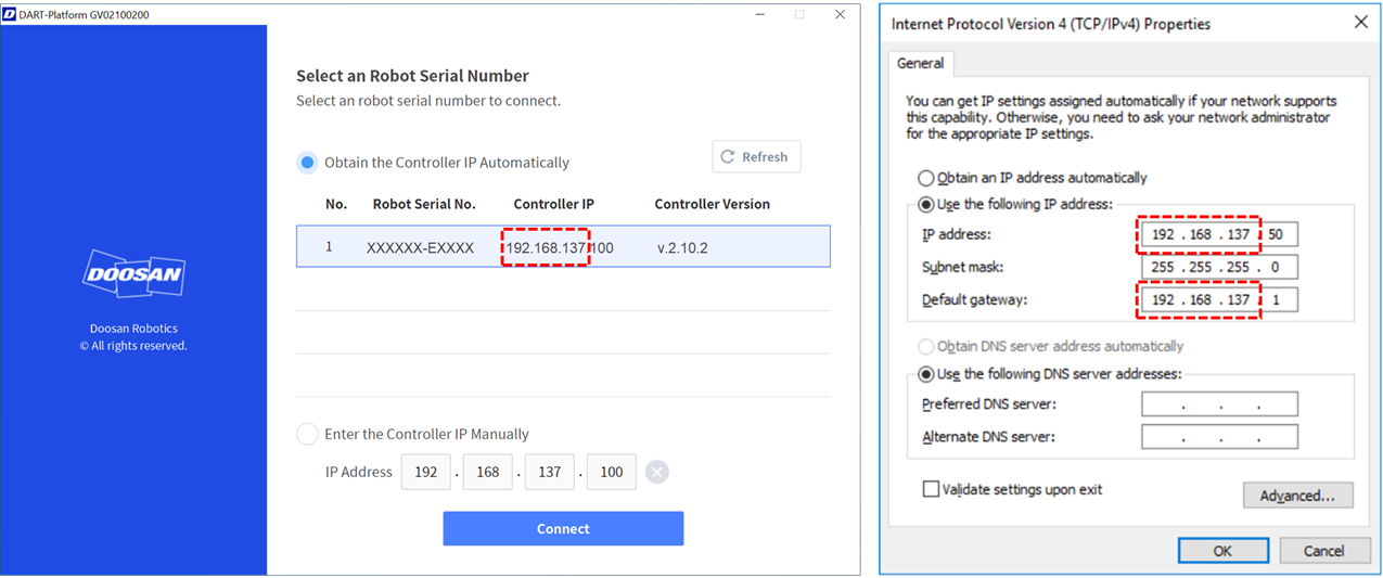 Jeśli nie ma połączenia między kontrolerem a platformą DART, zmień pasmo klasy C adresu IP i domyślnej bramy komputera stacjonarnego lub laptopa z zainstalowaną platformą DART na pasmo klasy C adresu IP kontrolera i spróbuj ponownie.