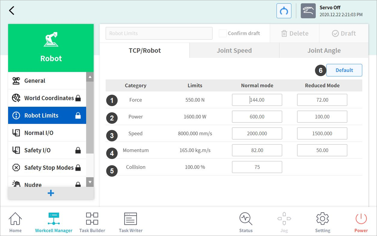 6 | Default Value | Przywraca limity TCP/robota do ustawień domyślnych. |