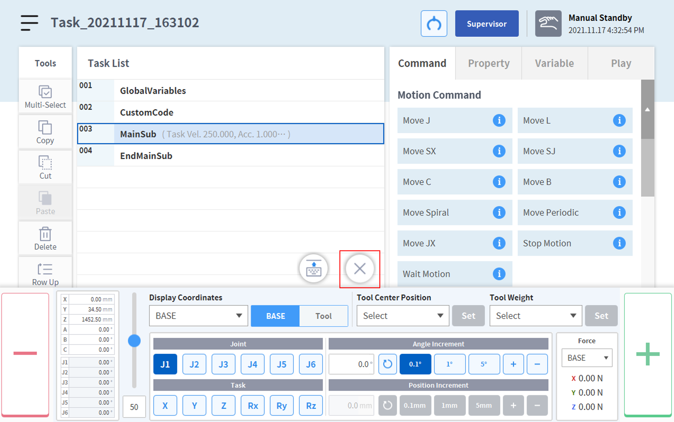 4 | Select Axis | Wybiera oś, która ma zostać przesunięta. Karta Joint: Wybrać jedną z osi z zakresu od J1 do J6. Karta Task: Wybrać jedną z osi z zakresu od X do Rz. |