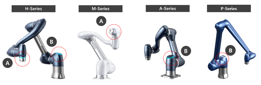 Pozycje diod LED każdej serii robotów Doosan Robotics są następujące: