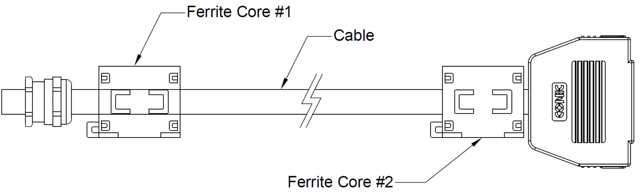- W przypadku gdy sterownik jest poddany działaniu zakłóceń generowanych przez fale elektromagnetyczne, zaleca się zainstalowanie rdzenia ferrytowego na każdym końcu kabla manipulatora w celu zapewnienia normalnego działania. Miejsca instalacji są następujące: