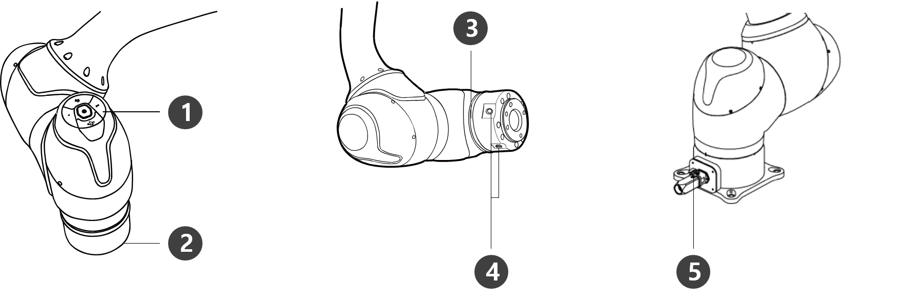 3 | Flange LED | Sygnalizuje stan robota za pomocą różnych kolorów. Aby uzyskać więcej informacji na temat stanu robota, patrz (2.12-pl_PL) Stan i kolor wskaźnika LED kołnierza w poszczególnych trybach Version : H Series W serii H na osi 1 znajduje się dodatkowy wskaźnik LED, który wskazuje ten sam stan i kolor. |