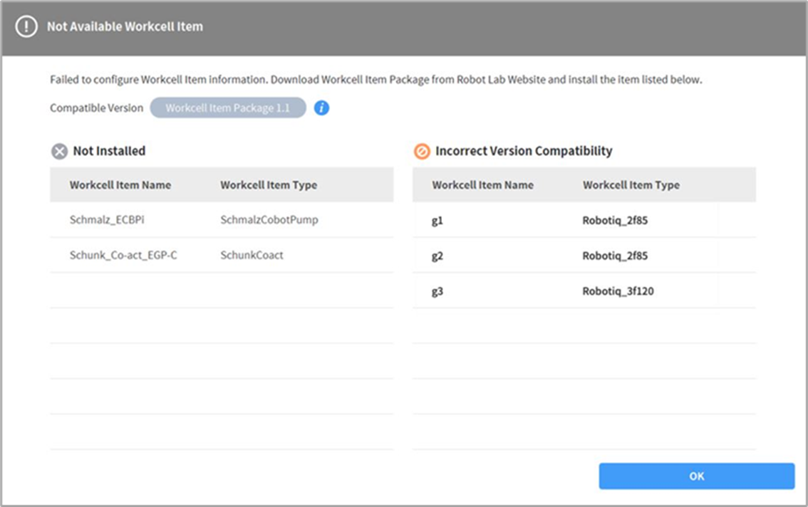 Wyświetla wersję pakietu elementu stanowiska roboczego zgodną z aktualnym oprogramowaniem, niezainstalowane elementy stanowiska roboczego oraz nazwę i typ niezgodnych elementów stanowiska roboczego. Aby korzystać prawidłowo z takich elementów stanowiska roboczego, należy pobrać i zainstalować element stanowiska roboczego z Doosan Mate.