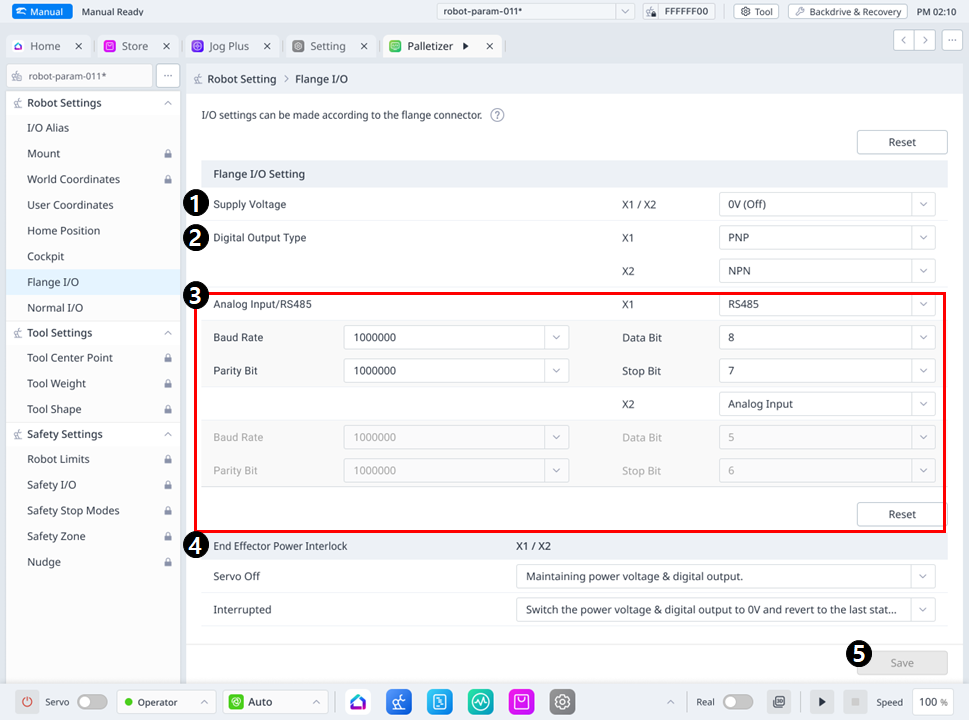 | 4 | End Effector Power Interlock | Fornece uma função para definir a operação quando o servo está desligado ou interrompido. - Na série A, a caixa de seleção Servo Off está desabilitada.