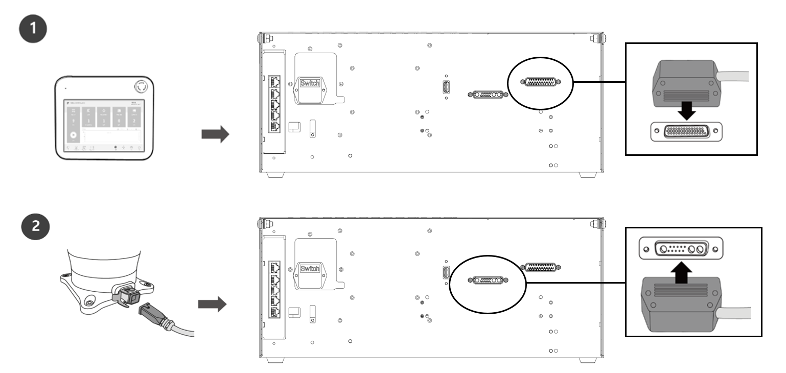 - Empurre a extremidade oposta do cabo do robô para dentro do conetor do controlador correspondente até ouvir um clique para evitar que o cabo se solte.