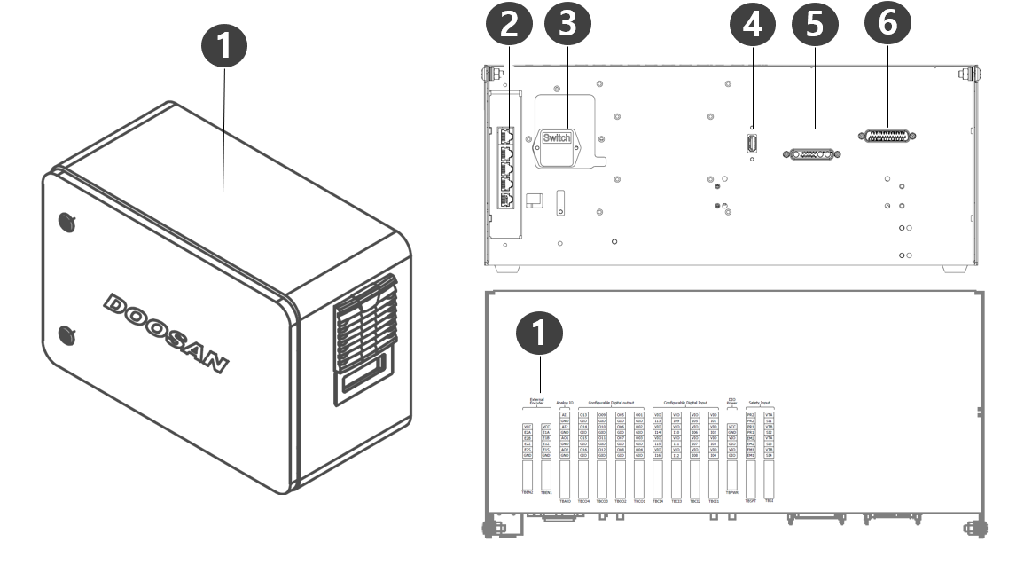 1 | Terminal de ligação de E/S (interno) | Ele pode ser conetado com outros controladores ou periféricos de robôs. |