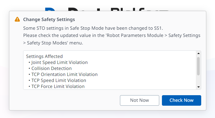 | 6 | Violação do limite do ângulo da articulação | Uma Parada de segurança pode ser selecionada para ser usada para o item correspondente. Os menus suspensos incluem: STO SS1 SS2 |