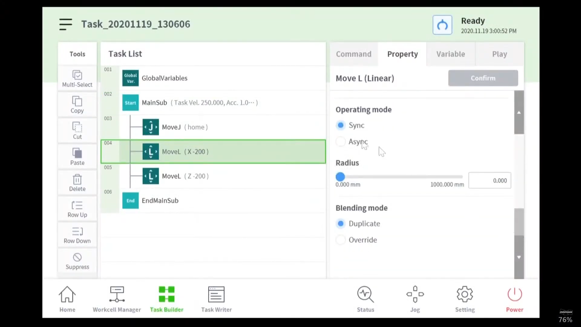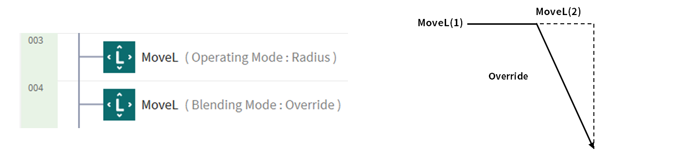 Assíncrono executa o seguinte comando assim que o comando de movimento é iniciado: É utilizado principalmente para uma ligação suave entre movimento e é utilizado para controlo de força, para ligar/desligar a saída do sinal de mudança de direção ao mesmo tempo que o movimento é iniciado.