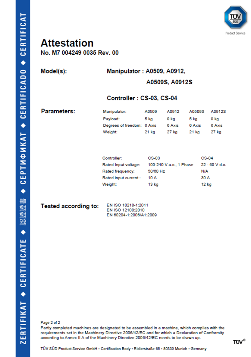 Certificado de acordo com a norma harmonizada da Diretiva Europeia sobre Máquinas