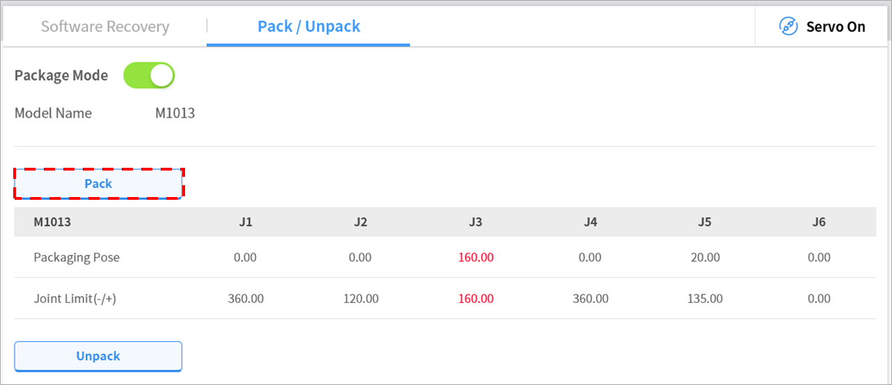 • Quando soltar a postura da embalagem , toque no botão Desposição da Embalagem para mover o robot para a posição inicial e toque no botão de alternância do Modo de Embalagempara desativar o modo de embalagem.