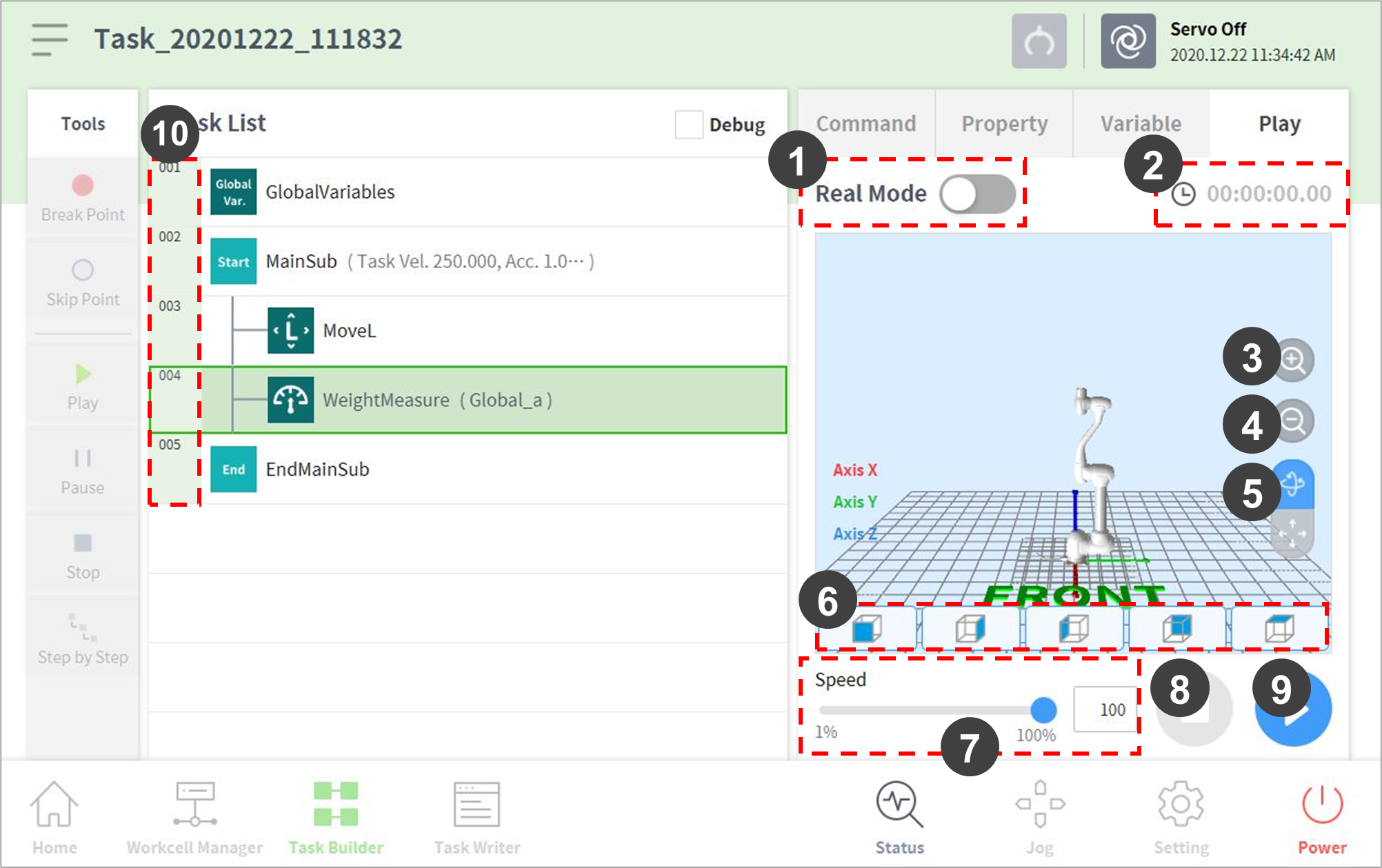 O ecrã Virtual Mode Play do Task Builder está organizado da seguinte forma: