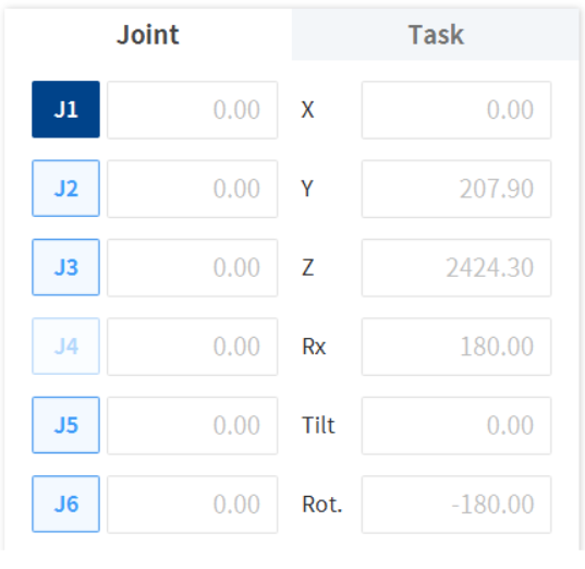Selecione o eixo para ajustar o ângulo (J1-J6). (J4 está desativado para os modelos da série P)