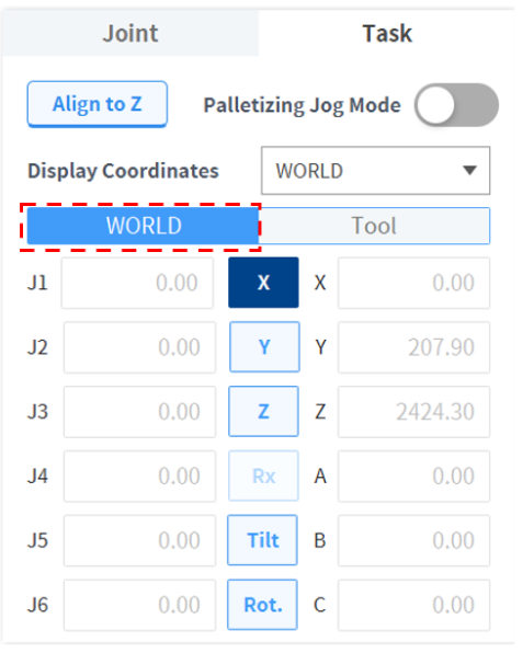 - Selecione o Sistema de Coordenadas Mundial que deseja mover. (Rx está inativo para os modelos da série P)
