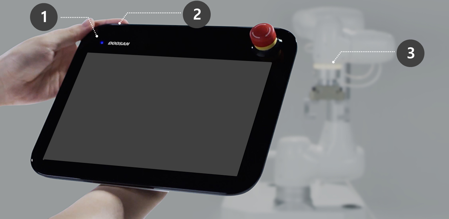 2. Pressione e segure o botão liga/desliga ( Figura 2 ) até que a tela do pendente de laser seja ligada. O LED do dispositivo Teach-pendente (n.o 1) e o LED da flange (n.o 3) piscam a vermelho até a ligação de rede ao controlador robótico estar concluída.