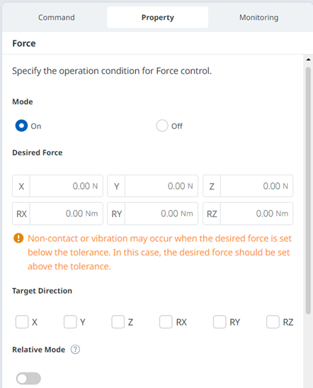 - 当启用相对模式时,应用于目标的实际力等于设定的力。