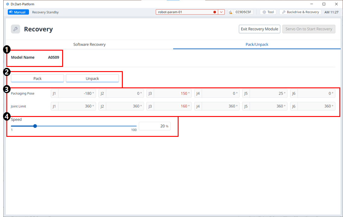 恢复模块:如果继续违反安全规定出错,或者需要包装机械手进行运输,用户可以使用安全恢复模式配置机械手的位置和角度。