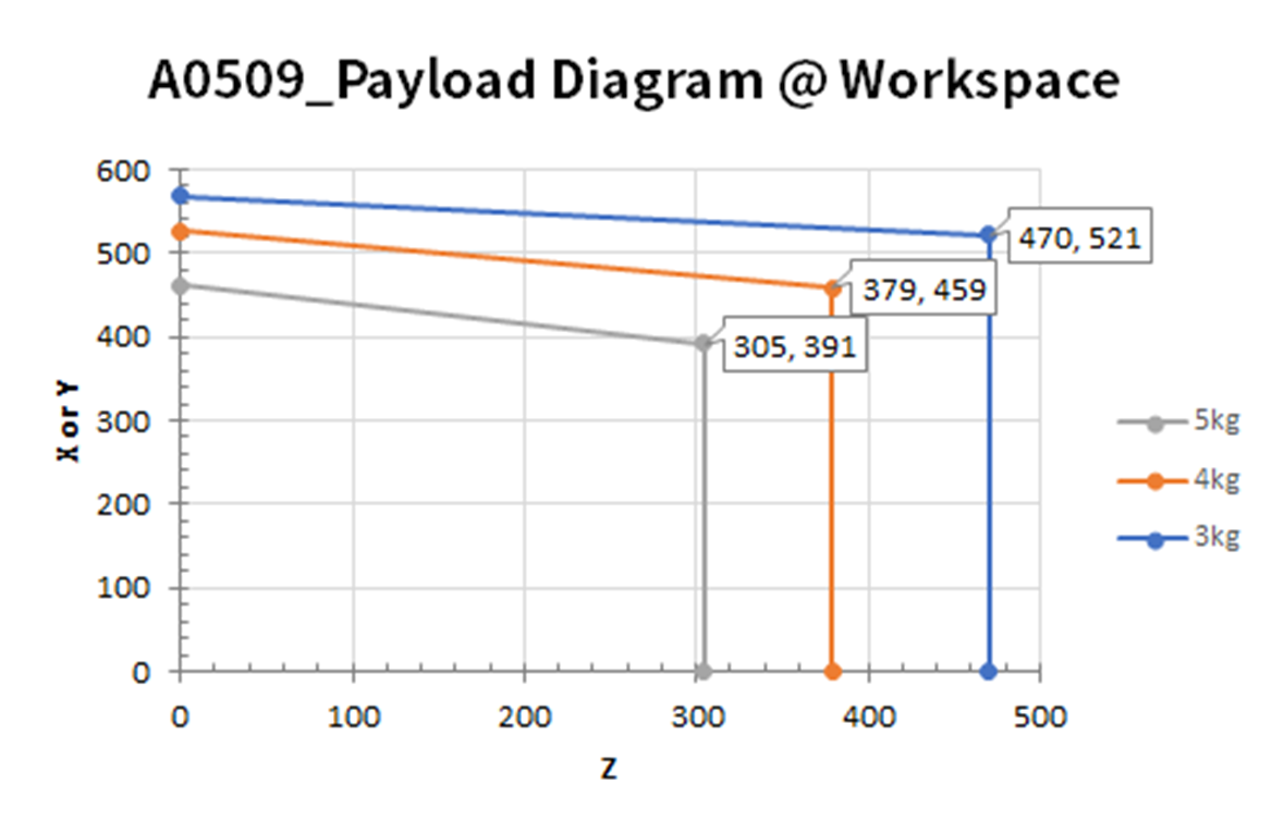 机器人在其运行空间内的最大有效载荷会随着与重心的距离变化。不同距离下的有效载荷如下: