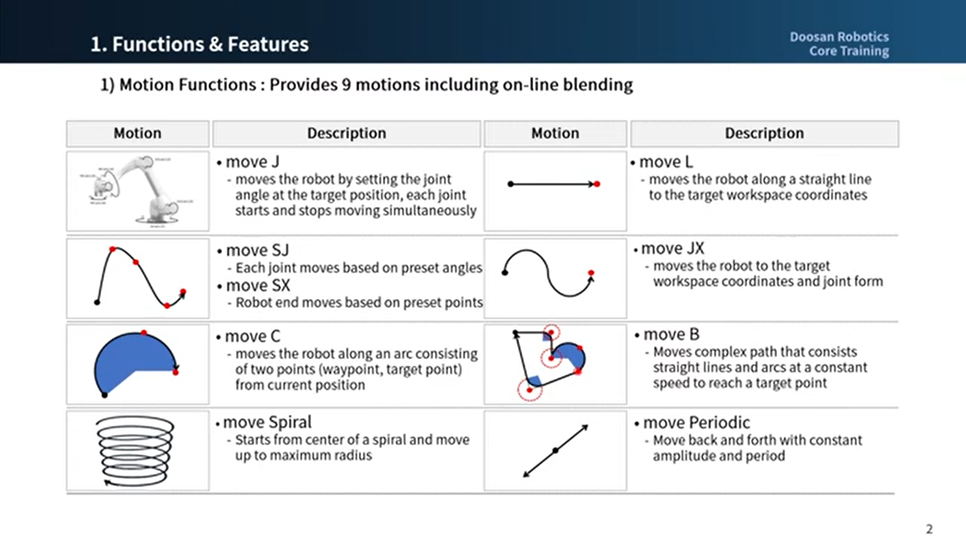 斗山机器人机器人提供 9 种动作。机械手的移动由标准动作 MoveJ 和 MoveL 以及这两个动作所衍生的 7 个动作控制。