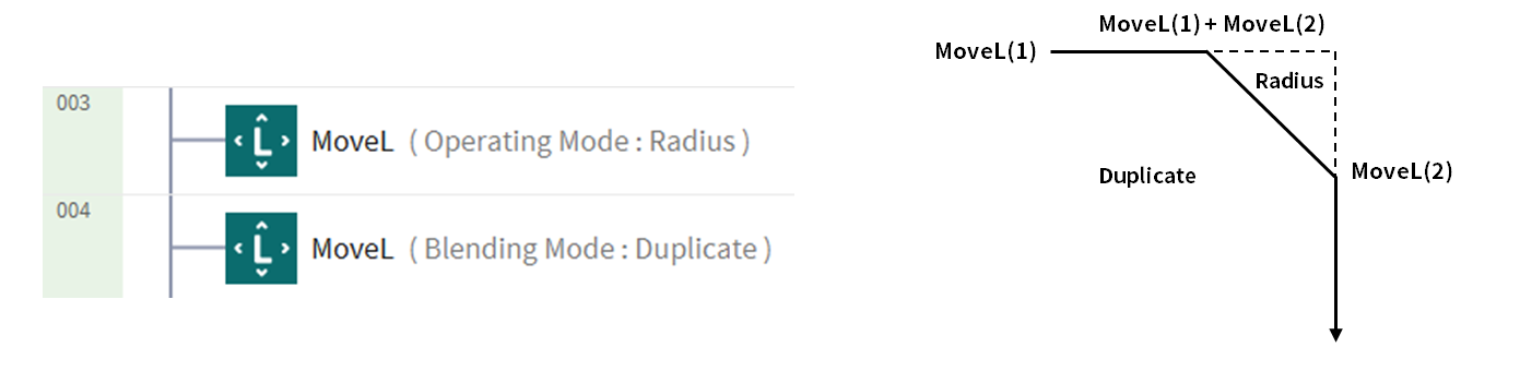 - 不能在动作之间应用混合的动作命令如下:这些命令中已经应用了混合,因此对这些命令应用 RADIUS 并执行它们会导致错误。使用 WaitMotion 和 StopMotion 等命令有助于避免错误。