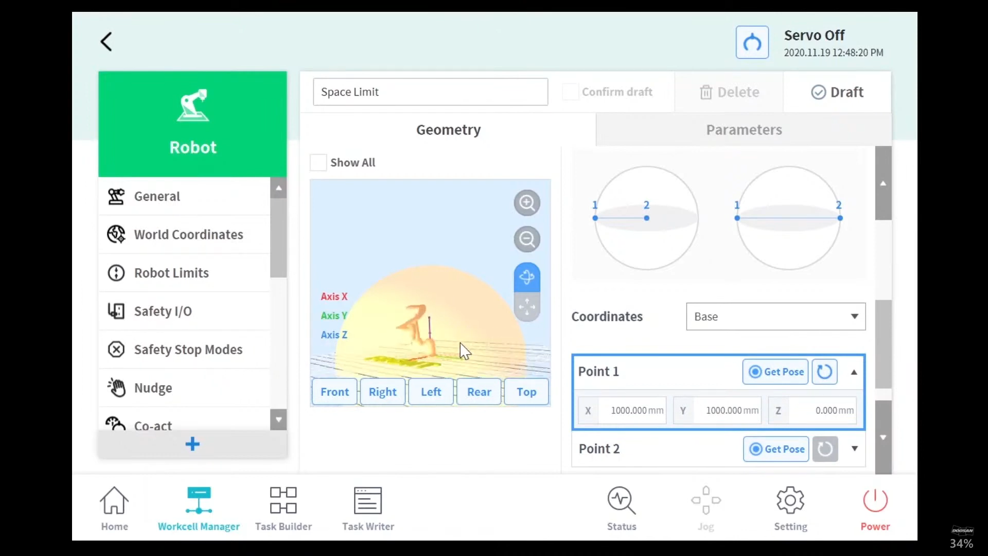 空间限制工作单元项目在机械手最外层区域设置虚拟边界。可以在不设置空间限制的情况下操作机械手,但建议设置空间限制以确保机械手的安全操作。