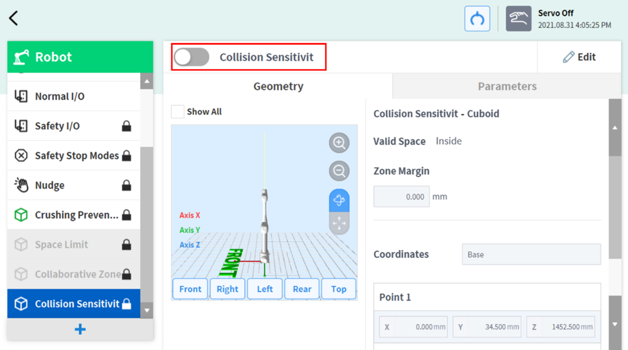 要设置碰撞灵敏度降低区域,请在机器人工作单元中点击