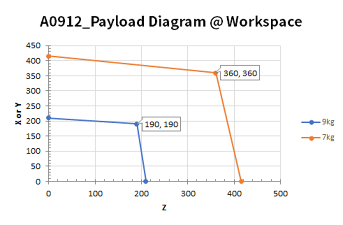 机器人在其运行空间内的最大有效载荷会随着与重心的距离变化。不同距离下的有效载荷如下: